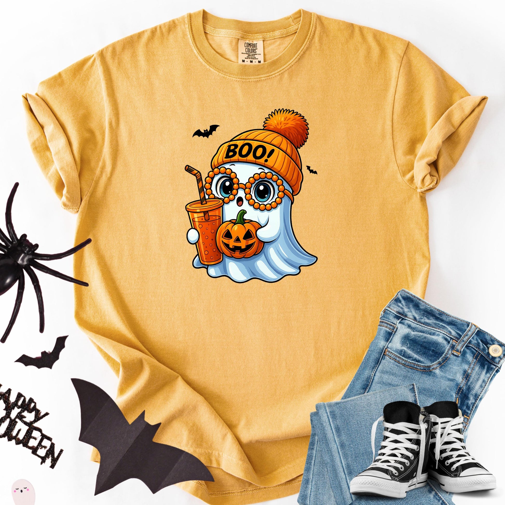 Add some spooky-cute vibes to your fall wardrobe with this Cute Ghost Halloween Shirt. Featuring an adorable ghost in a beanie hat with pumpkin and drink, this kawaii graphic tee is perfect for Halloween parties, pumpkin patch trips, or cozy fall days.