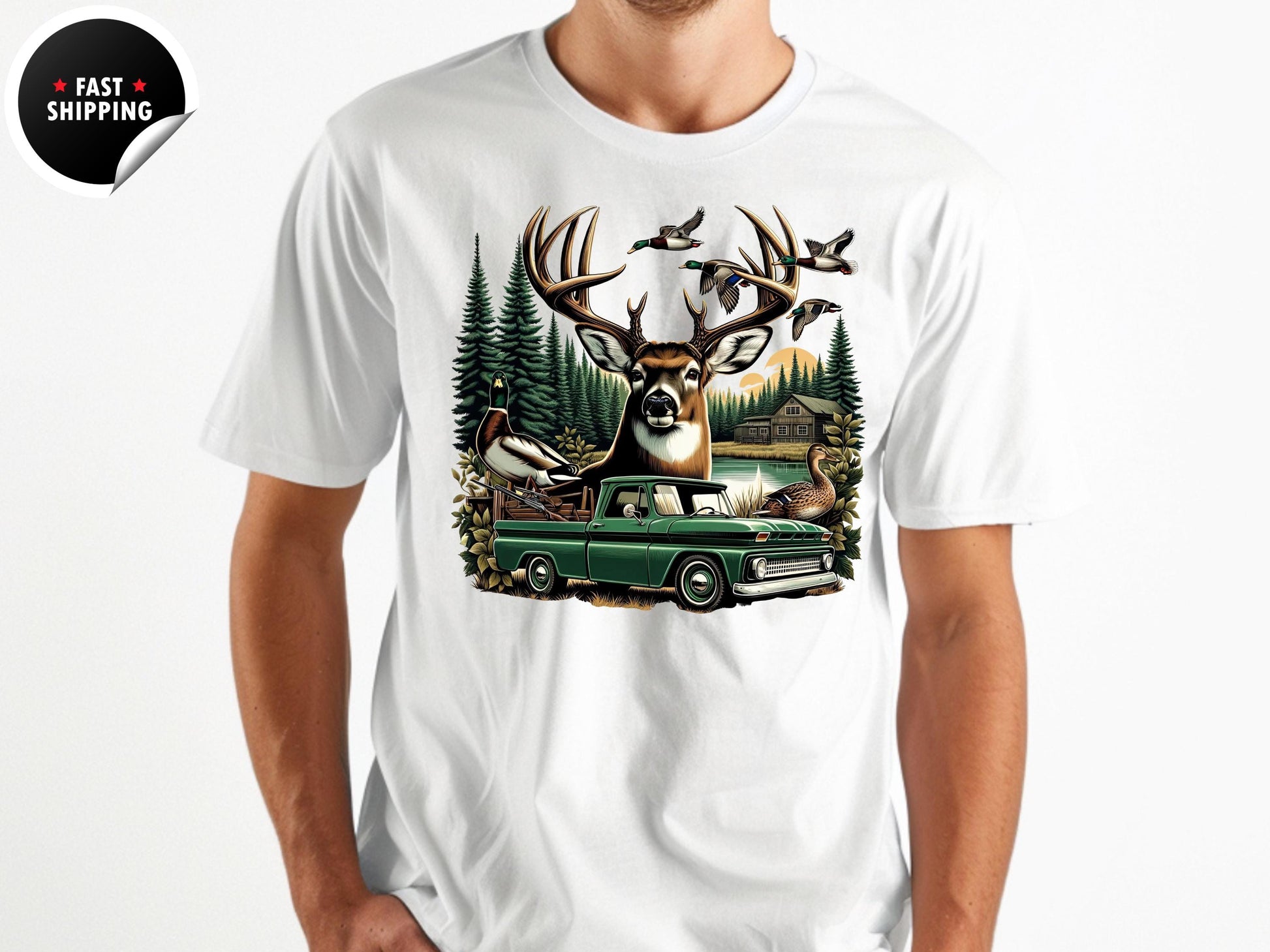 This hunting graphic t-shirt features a powerful buck deer, flying ducks, a vintage green pickup truck, and a rustic cabin in the woods – the perfect design for hunters, outdoorsmen, and anyone who loves country life.