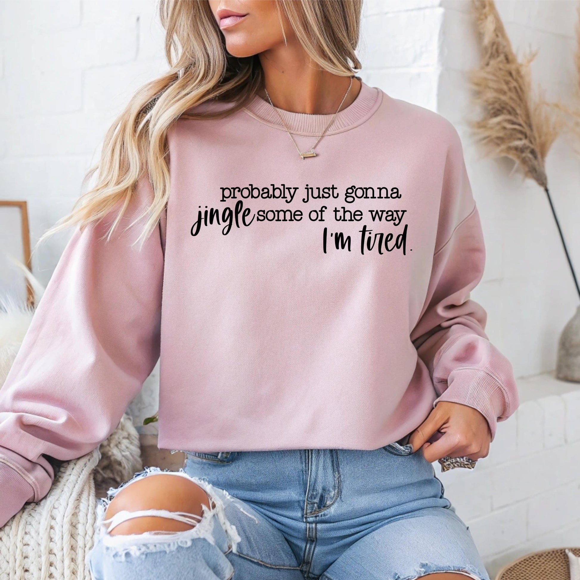 Add humor to your holidays with this Funny Christmas Sweatshirt! Printed with the witty quote “probably just gonna jingle some of the way, I’m tired”, this cozy pullover makes a perfect holiday outfit or funny Christmas gift.