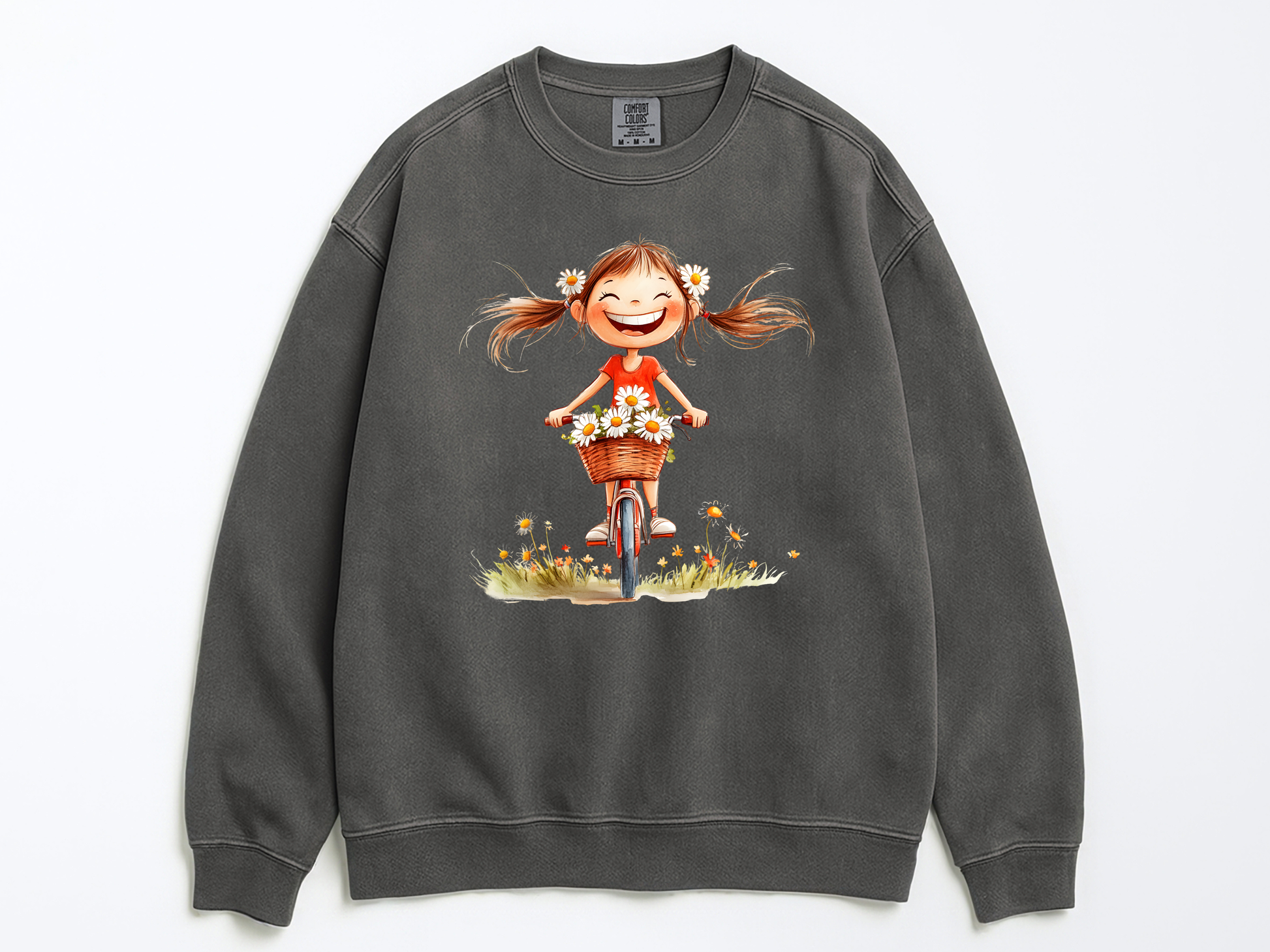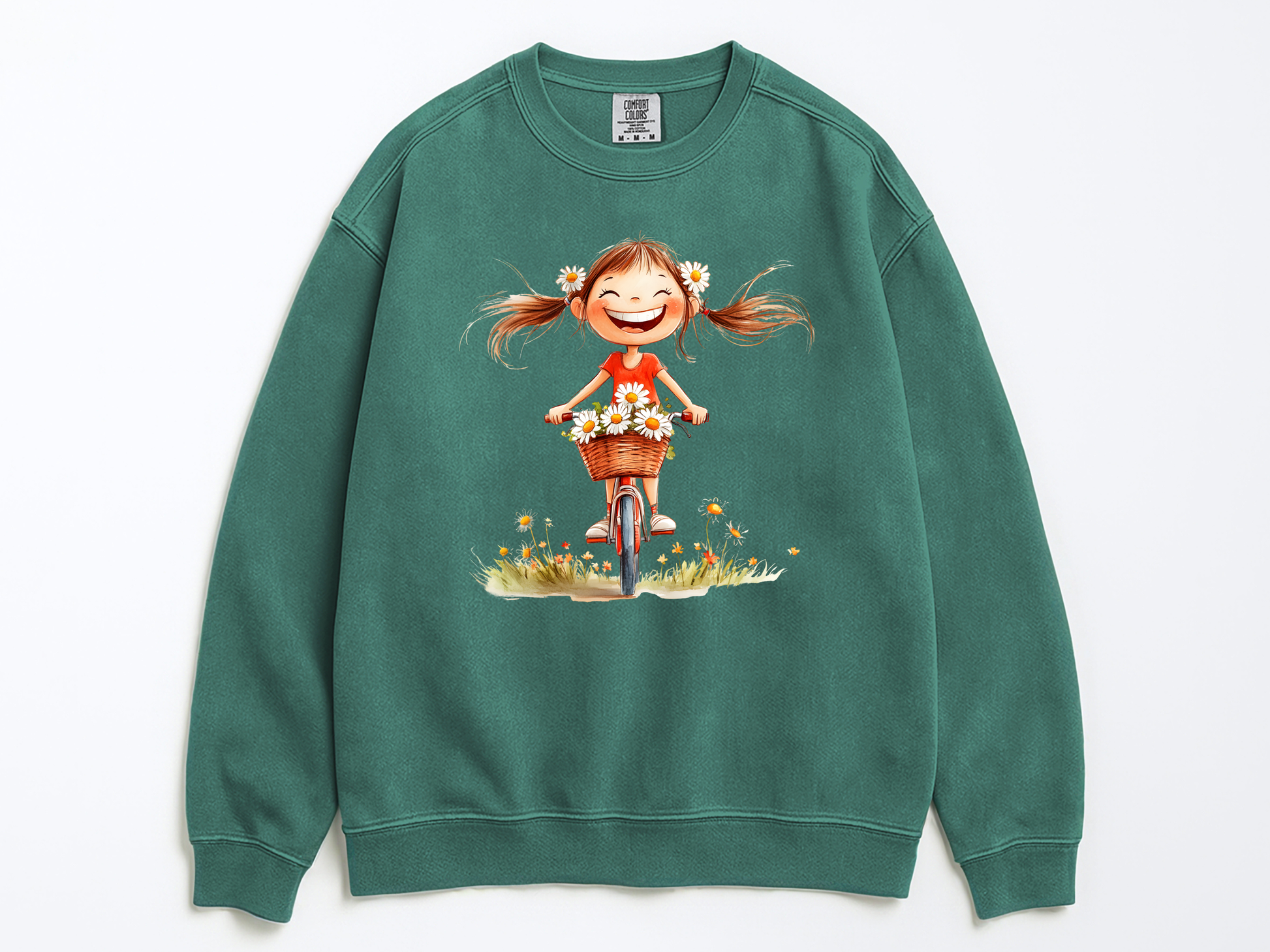 Happy Girl Sweatshirt | Daisy Crewneck Sweater | Vintage Floral Pullover | Cute Bike Girl Top | Cozy Boho Positive Vibes